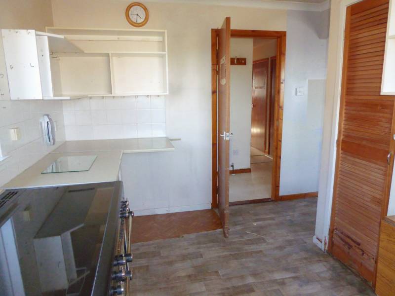 KITCHEN – Approx. 3.38m x 3.14m - This bright room has windows facing East and South and an archway leads to the open plan Kitchen from the Living Room. Rangemaster with two ovens and ceramic hob above. The kitchen units require some refurbishment. Tiled splash back above the unit worktops.